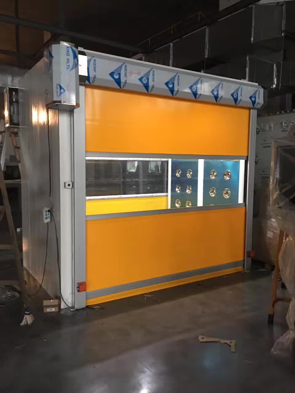 材料符合DINEN12641-2(德國+歐洲)標準.快速門的透視方式:采用全透明PVC軟片整體橫向透明視窗,人員、車輛通過時增加了安全及管理方便性。產(chǎn)地:日本,厚度1.5mm。