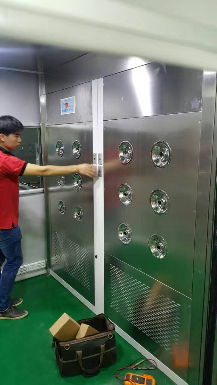 9、打開內(nèi)門,外門上電子互鎖,風(fēng)淋室照明燈亮,工作指示燈亮,人走進(jìn)風(fēng)淋室,關(guān)上內(nèi)門,內(nèi)外門解鎖,系統(tǒng)開始檢測(cè)是否有人在風(fēng)淋室。