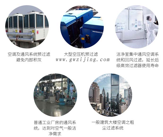 空調(diào)及通風(fēng)系統(tǒng)預(yù)過濾避免內(nèi)部積灰、大型空壓機(jī)預(yù)過濾、潔凈室集中通風(fēng)空調(diào)系統(tǒng)和回風(fēng)過濾、延長(zhǎng)后級(jí)高效過濾器使用壽命、普通工業(yè)廠房的通風(fēng)系統(tǒng)、一般建筑大樓空調(diào)之粗塵過濾系統(tǒng)、達(dá)到對(duì)空氣一般潔凈需求。