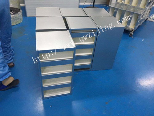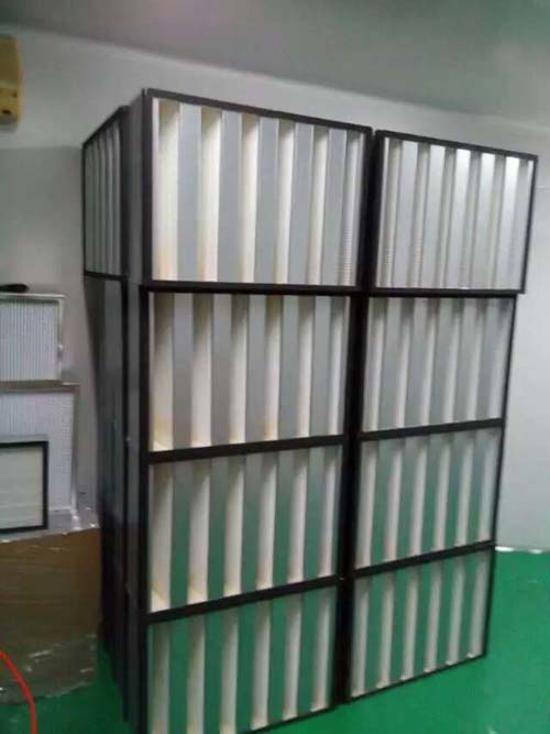 2、系列的大風量高效過濾器的濾料選用的是進口的超細玻璃纖維,濾料經無隔板技術折疊成型後放在V型的框架內。