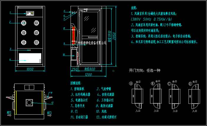 1200風(fēng)淋室標(biāo)準(zhǔn)尺寸技術(shù)參數(shù):