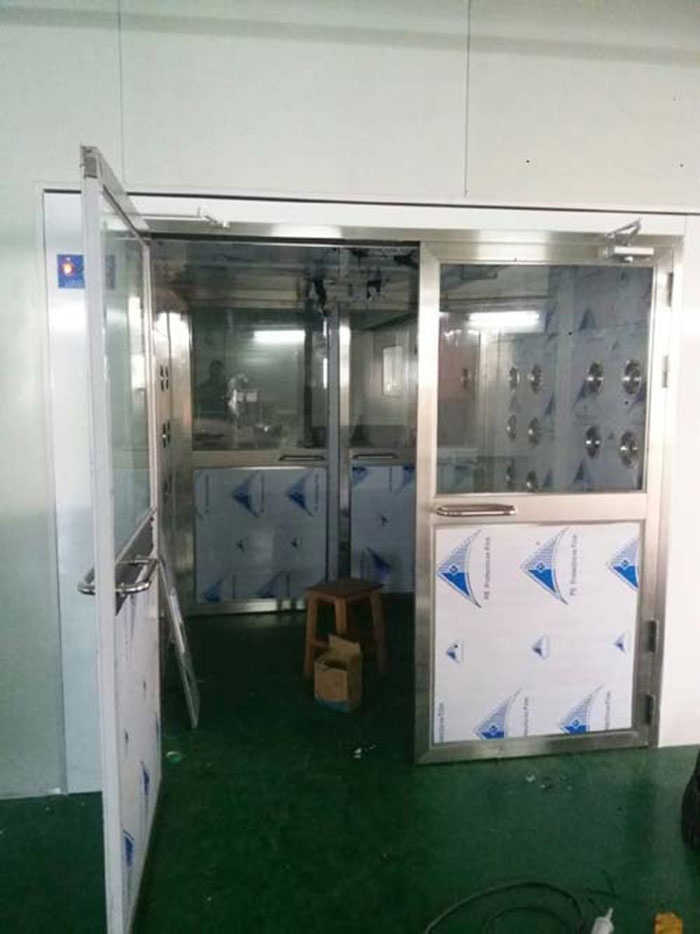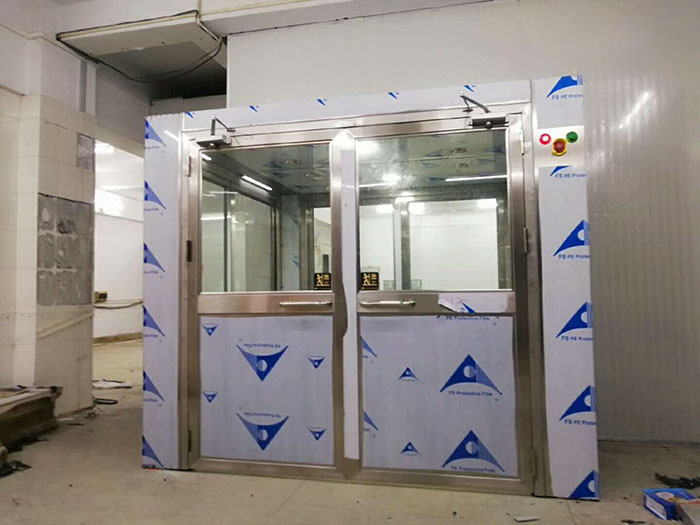 3、手動(dòng)雙開門貨物風(fēng)淋室閉門器選擇90度定位,手動(dòng)雙開門人淋風(fēng)淋室閉門器選擇不定位的。貨物風(fēng)淋室現(xiàn)場(chǎng)安裝圖貨物風(fēng)淋室制作及功能: