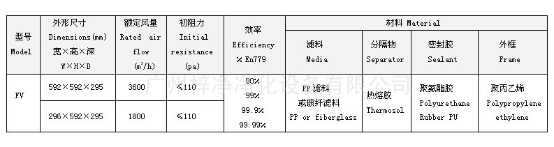 FV組合式亞高效過濾器型號(hào)、尺寸及其它參數(shù):
