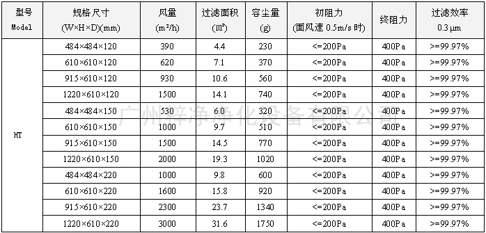 400度耐高溫高效過(guò)濾器型號(hào)尺寸及其它技術(shù)參數(shù):