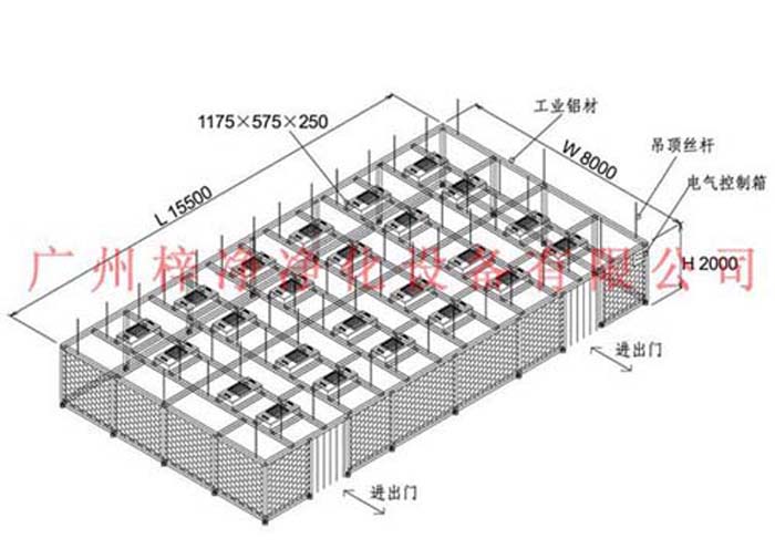 材料以鋼方通噴塑作為框架,采用風機濾網機組FFU送風,凈化棚四周圍用防靜電垂簾,頂部鋪蓋密縫盲板,形成一個密縫區(qū),內部凈化級別可達10—100000級;特別適用于車間內局部凈化級別要求高的區(qū)域,如流水線作業(yè)區(qū)域。高精確度產品組裝區(qū)。