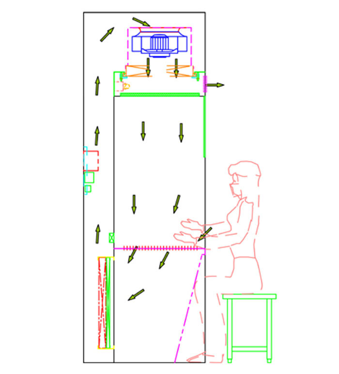 由于在工作區(qū)域形成穩(wěn)定的單向流,在此區(qū)域中散發(fā)的粉塵,會(huì)在單向氣流的影響下,隨著氣流而被初、中效過濾器所捕集。設(shè)備帶有10%的排風(fēng),從而形成相對(duì)與外部環(huán)境的負(fù)壓,從一定程度上保證了此區(qū)域內(nèi)的粉塵不會(huì)擴(kuò)散至室外,起到保護(hù)外部環(huán)境的作用。